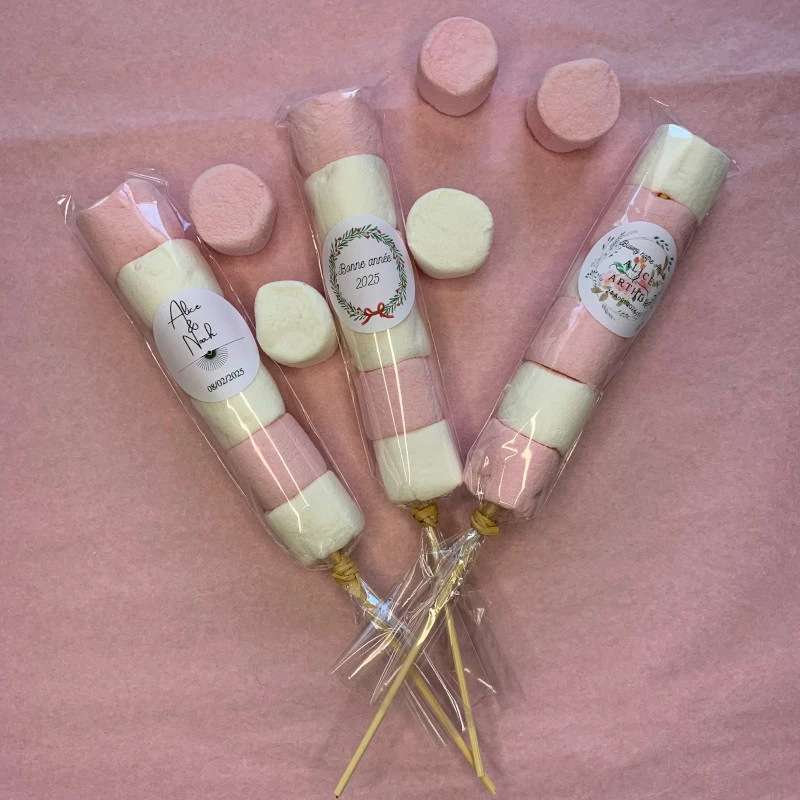 Composées de 6 guimauves moelleuses aux nuances douces (blanc, rose et/ou multicolore), ces brochettes sont joliment assemblées sur un bâtonnet et emballées individuellement. Un vrai régal visuel et gustatif qui plaira à tous vos invités.