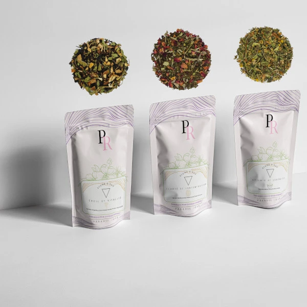 Clarté et Concentration | – Ingrédient : Thé Vert Sencha (40%), Menthe poivrée (25%), Pétales de rose (15%), Sauge (15%), Poivre noir (5%) |