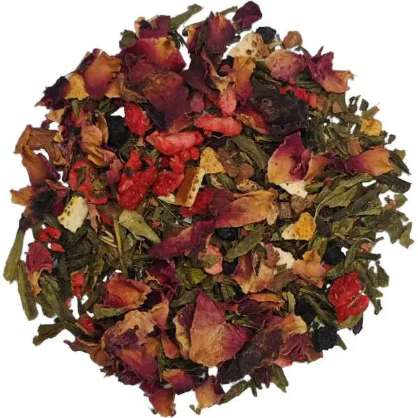 Clarté et Concentration | – Ingrédient : Thé Vert Gunpowder (40%), Pétales de rose (15%), Camomille Matricaire (15%), Fraise séchée (10%), Écorces d'orange (10%), Myrtille séchée (10%) |