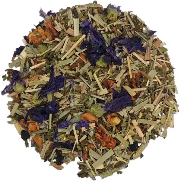 Détente et Sérénité | – Ingrédient : Citronnelle (30%), Pomme séchée (25%), Menthe (20%), Lavande (10%), Myrtille séchée (10%), Mauve (5%) |