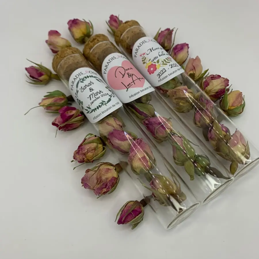 Évoquant la tendresse et la poésie, ce tube à essai transparent contient de véritables boutons de rose séchés, soigneusement sélectionnés pour leur beauté et leur parfum subtil. Roses tendres, jaunes solaires… chaque éprouvette contient un petit concentré de nature à offrir ou à savourer.